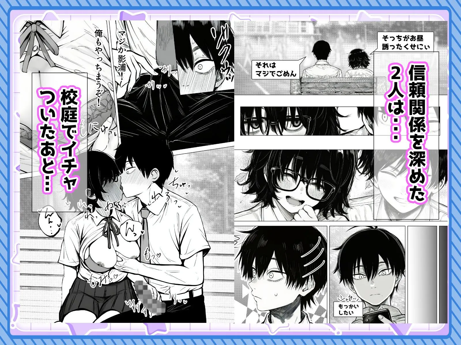 校庭、授業中、そして廊下。普通なら絶対に見つかる場所なのに、彼らは「陰キャだから大丈夫」と本気で信じてる。その危うい確信が、読んでいる側に凄まじい臨場感を与えてくれるんだ。空気の冷たさや、誰かが来るかもしれないという緊張感、そして隣にいるパートナーの体温。画面越しなのに、その場の空気が肌に伝わってくるような錯覚に陥る。