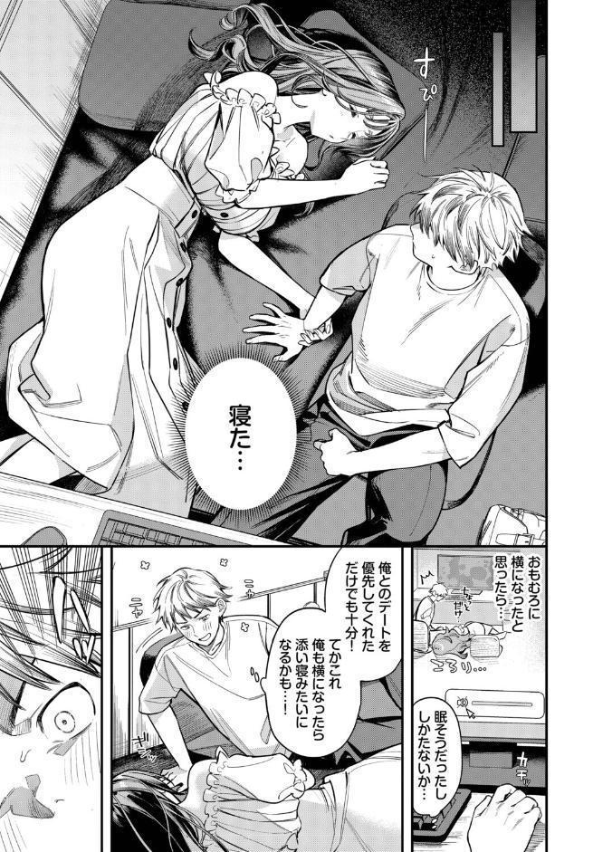 大学で出会った、女神のように美人で優しい先輩。そんな憧れの存在と付き合うことになった主人公。ある日、二人はネットカフェでデートをすることに。狭いブース、薄暗い照明、触れそうな距離感。ドキドキが止まらない中、ふと横を見るとカノジョが寝てしまっていて、そこからチラリと見えるエッチな下着……。理性と本能の限界バトルが始まり、気づけば二人は、狭い密室で超濃厚な時間に突入していく。